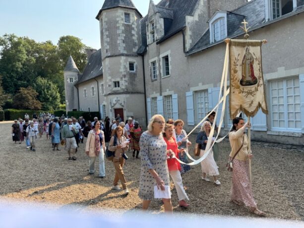 La rue de l’église n’étant pas accessible à cause de l’éboulement causé par la tempête du 25 juin, la procession entre la fontaine et l’église, une fois n’est pas coutume, est passé par le parc du château.