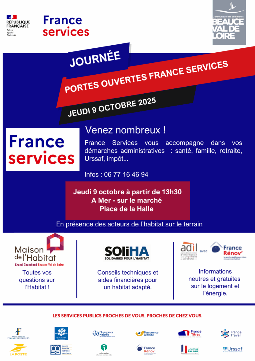 J’ai le plaisir de vous informer qu’une journée Portes ouvertes France Services se tiendra à Mer le jeudi 9 octobre 2025, à partir de 13h30. Cette initiative s’inscrit dans le cadre d’une mobilisation nationale visant à faire connaître les actions menées par l’ensemble des France Services.